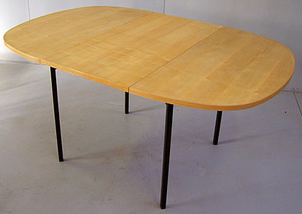 FRANCE 1950, TABLE DE SALLE A MANGER ,PIETEMENT EN FER LAQUE, PLATEAU ET RALLONGE EN PLACAGE DE CHENE BLOND